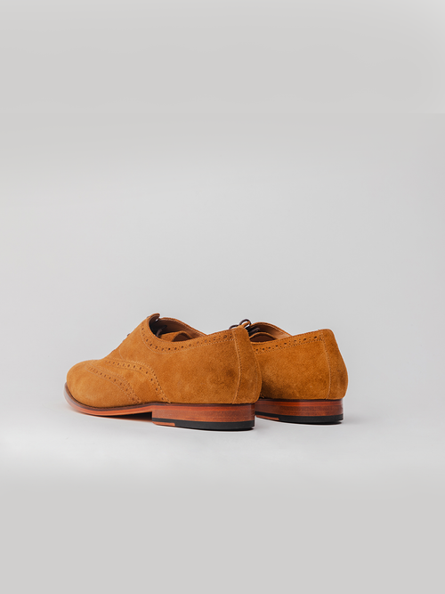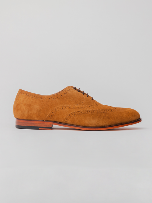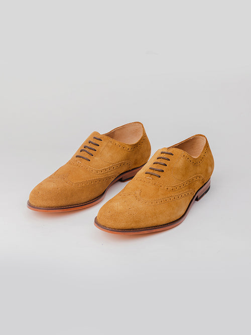 This handcrafted, Helio Wingtip Oxford - Cognac ,made in calf skin Suede leather, Stacked Leather Heel , Handmade Argentinean Leather sole along with fully lined Tan leather, stitch via the Blake stitched method for enhanced flexibility.