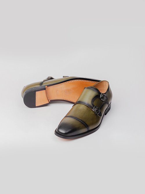 This handcrafted, Shubhan Double Monk - Olive Patina ,made in calf skin leather, Stacked Leather Heel , Handmade Argentinean Leather sole along with fully lined Tan leather, stitch via the Blake stitched method for enhanced flexibility.